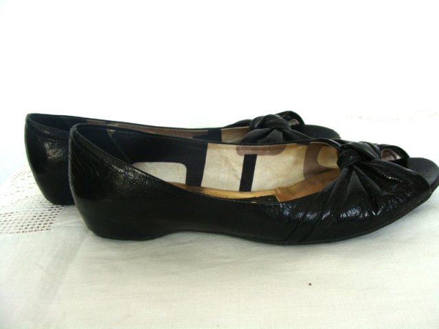 Baleriny z lakierowanej skóry naturalnej w czarnym kolorze, z odkrytymi palcami, z ozdobnym supłem.