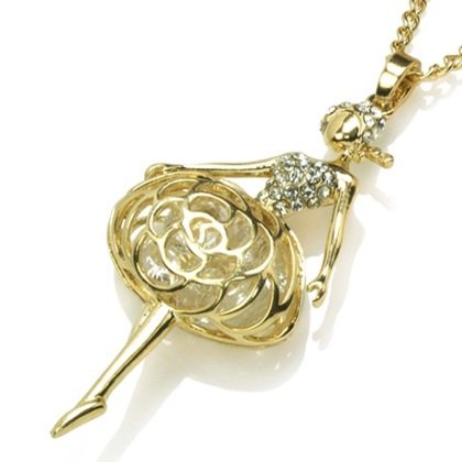 Uroczy wisiorek z baletnicą + długi łańcuszek z koralikami imitującymi perły. Bardzo starannie wykonany, w spódnicy baletnicy ukryte są mieniące się koraliki, a gorset i czapeczka pokryte są małymi kryształkami. Prawdziwa perełka!