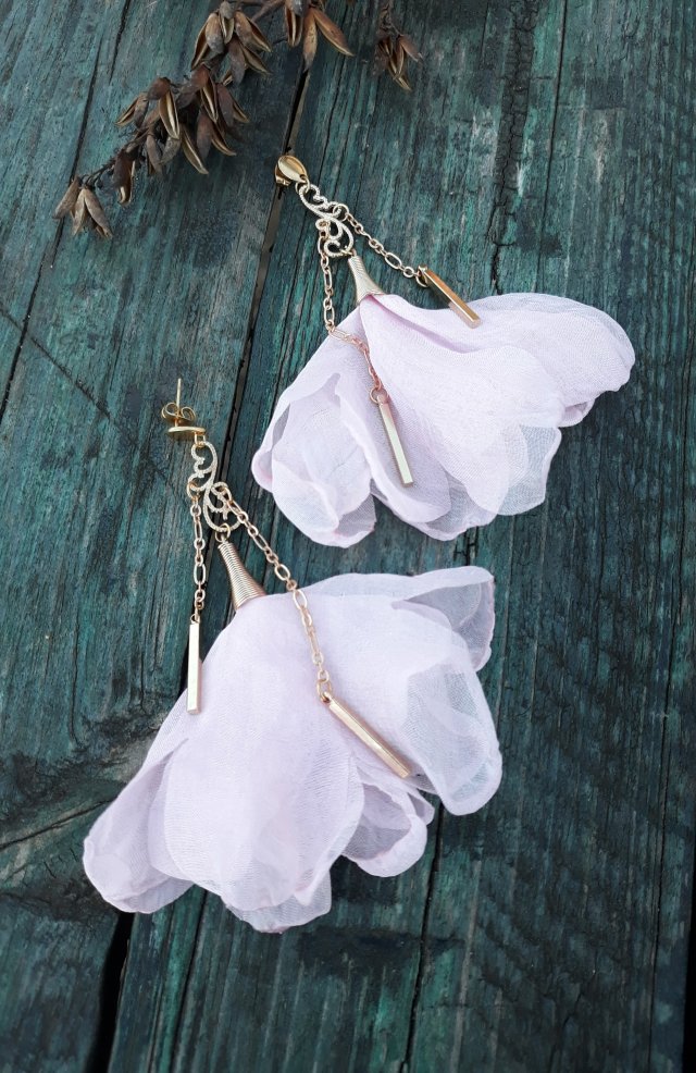 ,,baletnica w różu,, to zwiewne kolczyki wykonane z chwostów kwiatków w odcieniach pudrowego różu i metalowych elementów w kolorze złota. Kolczyki zawieszone są na ozdobnych biglach typu sztyft w kolorze złota wykonanych ze stali szlachetnej.
