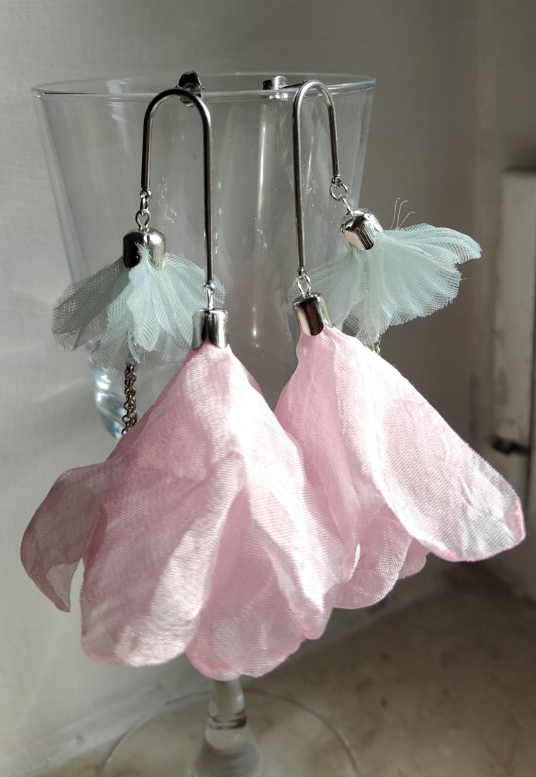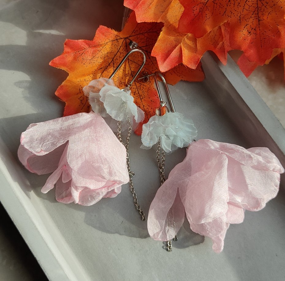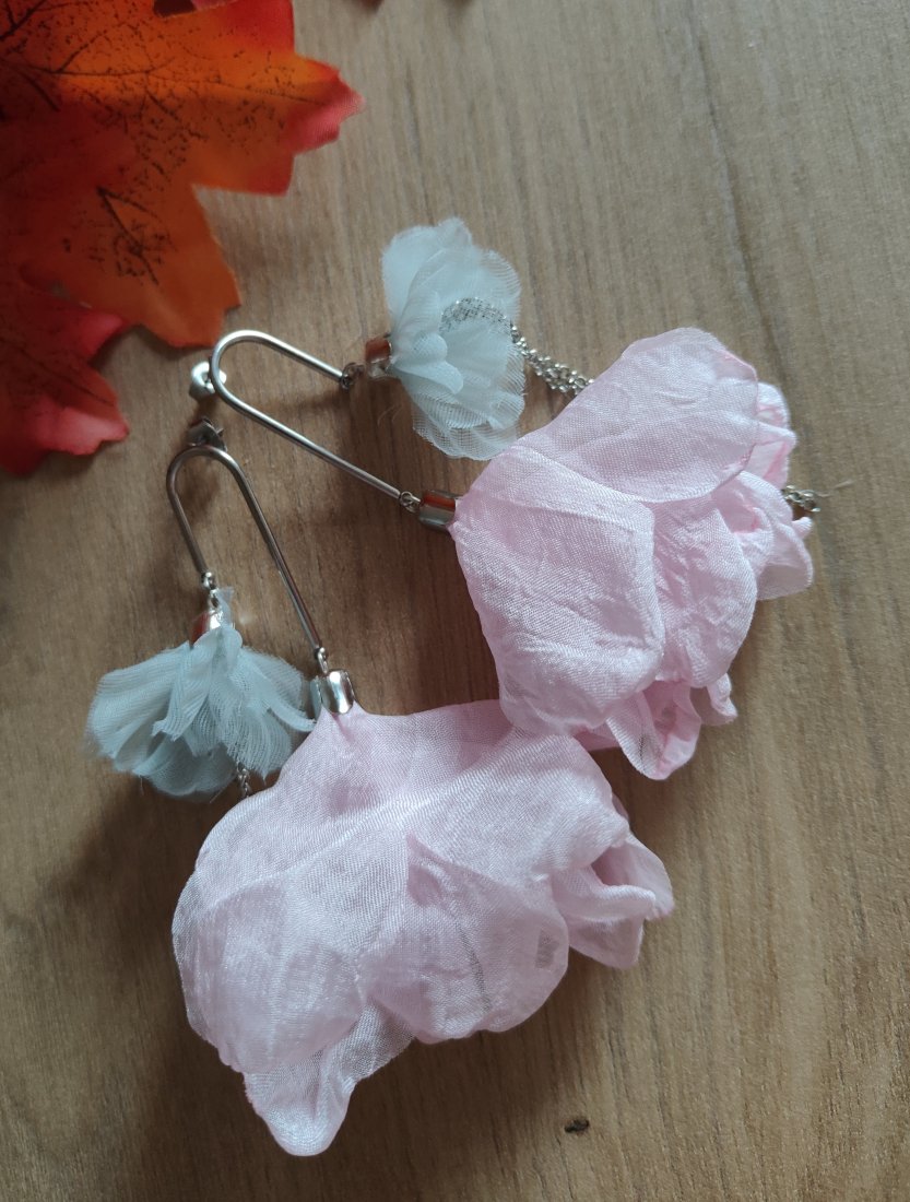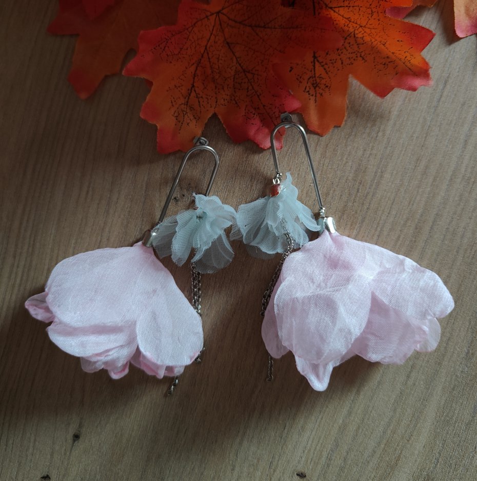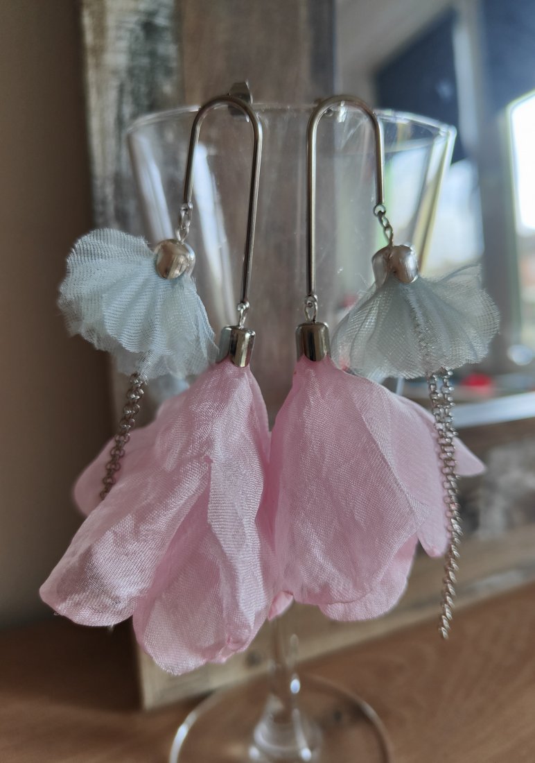 ,, baletnica w różu i szarości,, to lekkie i zwiewne kolczyki wykonane z chwosta kwiatków w odcieniu bladego różu i jasnej szarości, z dodatkiem elementu ozdobnego w postaci łańcuszka. Kolczyki zawieszone są na ozdobnych biglach typu sztyft wykonanych ze stali szlachetnej.