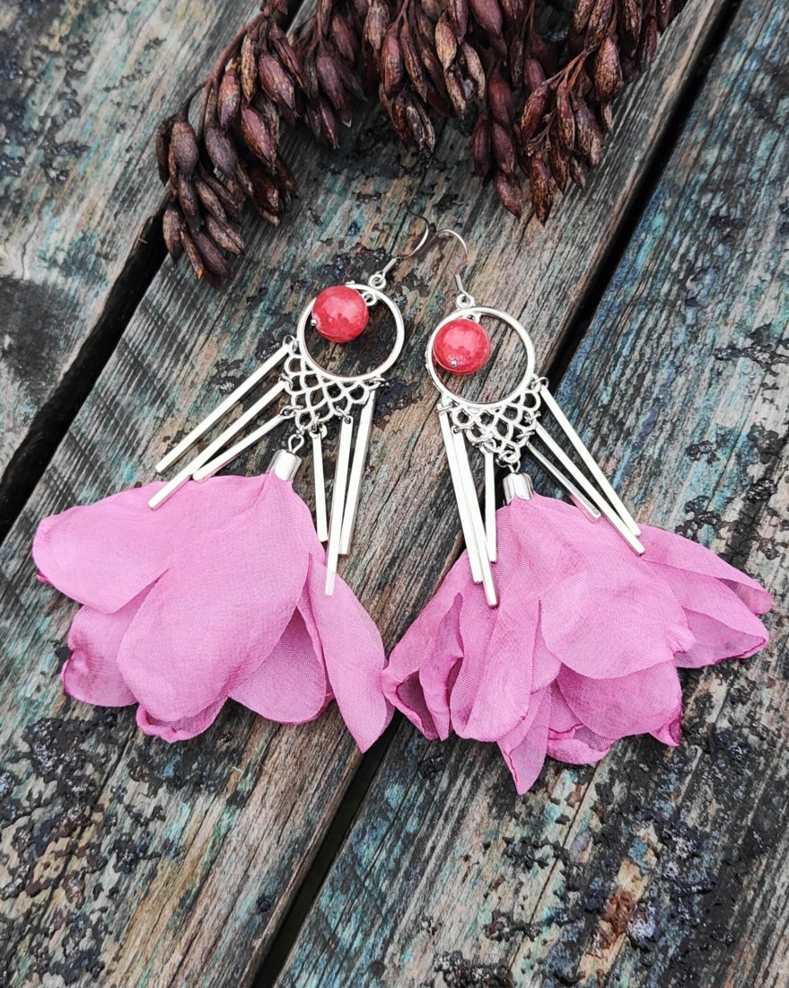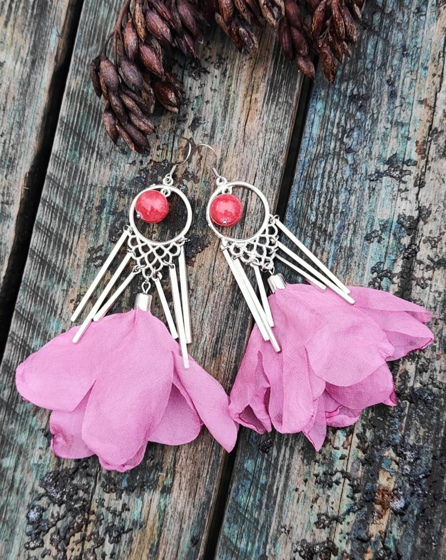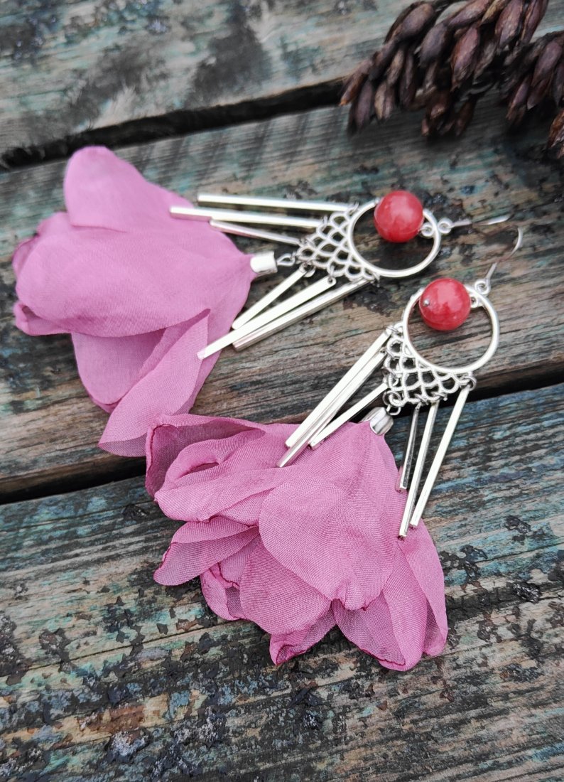 ,, baletnica we fiolecie,, to utrzymana w retro klimacie biżuteria wykonana z chwosta kwiatka w odcinku fioletu, różowego szklistego marmuru i ażurowej bazy. Kolczyki zawieszone są na klasycznych biglach wykonanych ze stali szlachetnej.