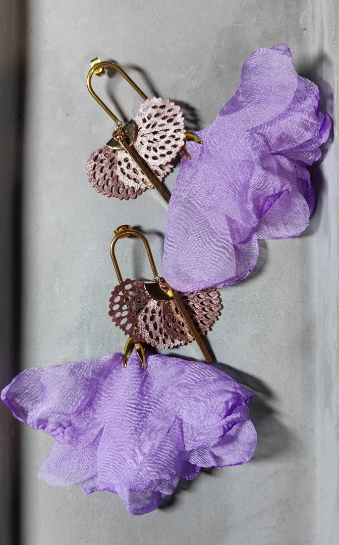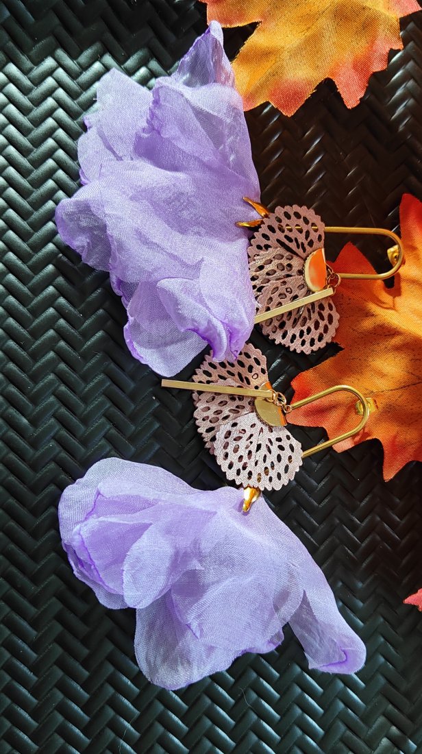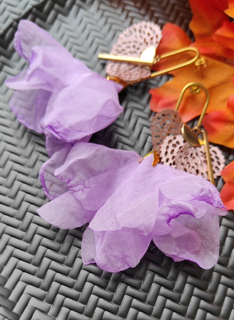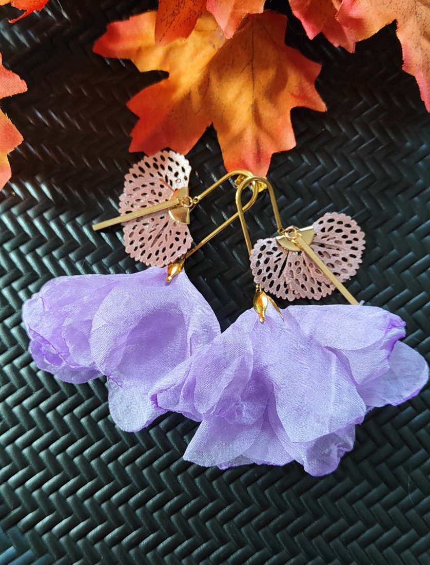 ,, baletnica z wachlarzykiem,, to niezwykle urokliwe kolczyki wykonane z satynowego kwiatka w odcieniu fioletu, chwosta wachlarzyka w odcieniu fioletu i elementów w odcieniu złota wykonanych ze stali szlachetnej. Kolczyki zawieszone są na ozdobnych biglach.