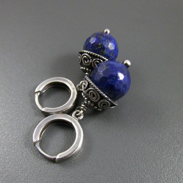 Kolczyki wykonane z fasetowanych kul lapis lazuli 10 mm. Całość oprawiona w srebro 925, oksydowane i wypolerowane, w tym miseczki bali. Długość kolczyków wynosi ok. 32 mm. Elegancko zapakowane.