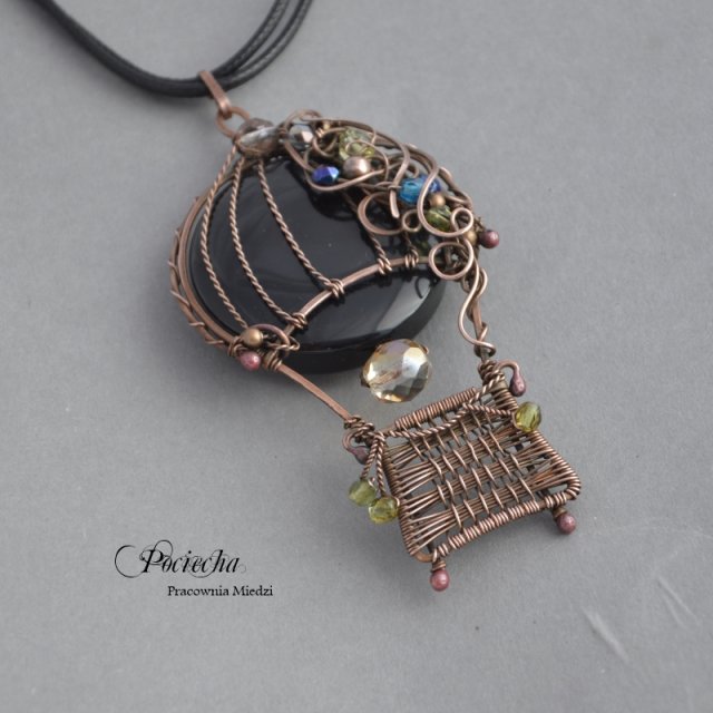 Niezwykły naszyjnik wykonany pracochłonną techniką z miedzi jubilerskiej. Serce wisiora stanowi piękny agat oraz liczne sploty. Całość uzupełniają szklane kryształki. Miedź patynowana i polerowana. Wisior ma ok 9,5 cm długości i 5 cm szerokości.