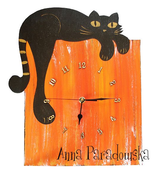 Pomysł na prezent. Na życzenie klienta dopisuję dedykację na odwrocie. Drewniany zegar z kotem, ręcznie malowany farbami akrylowymi (specjalna technika), zabezpieczony lakierem półmatowym. Mechanizm na paluszek (R6). Gwarancja na mechanizm 12 m-cy.