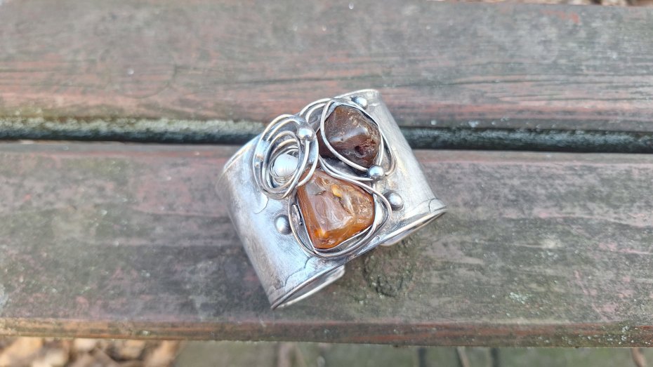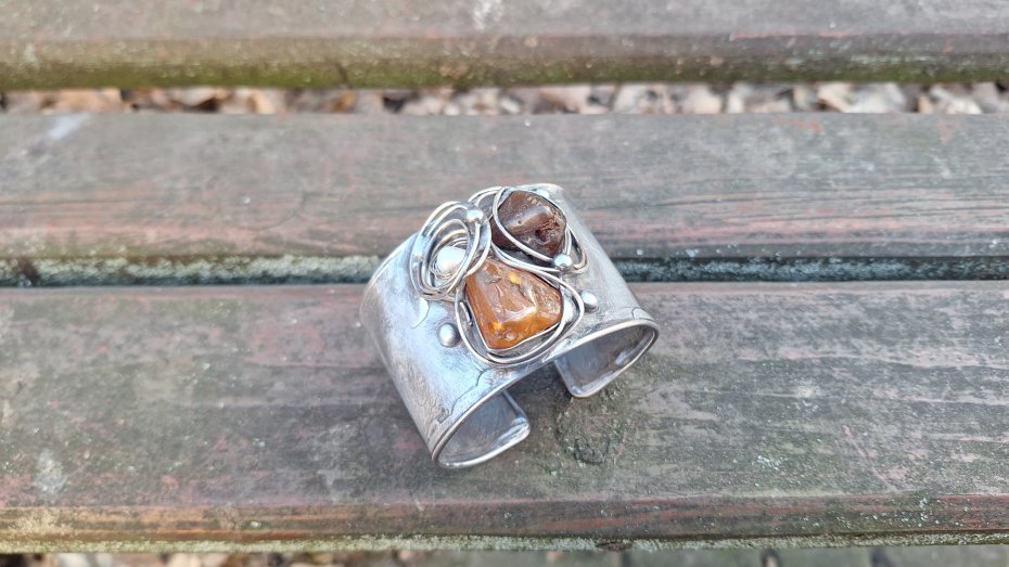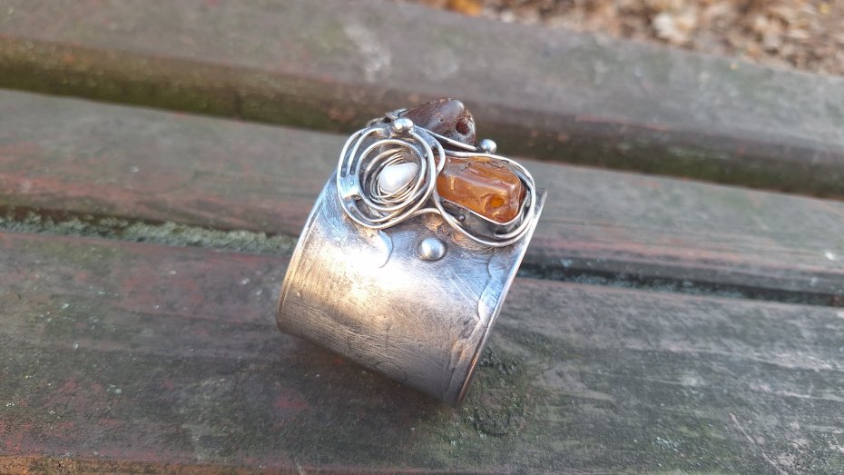 Lekka bransoleta wykonana z miedzi, cyny, perły i bursztynów. Szerokość ok. 4.5 cm; regulowana.