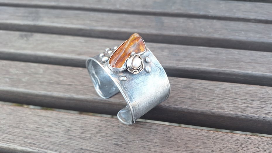Lekka bransoleta wykonana z miedzi, cyny, perły i bursztynu. Szerokość ok. 4 cm; regulowana.