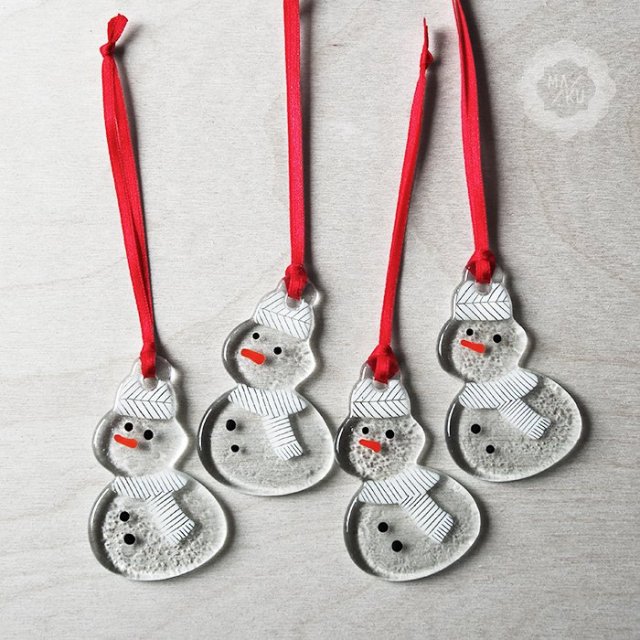 Zestaw czterech autorskich świątecznych zawieszek na choinkę wykonanych ze szkła metodą fusingu. Elementy wykonane ze szkła bezbarwnego z ręcznie malowanym i wypalanym wzorem na powierzchni. Spód szkła posiada delikatną fakturę ciekawie odbijającą światło.