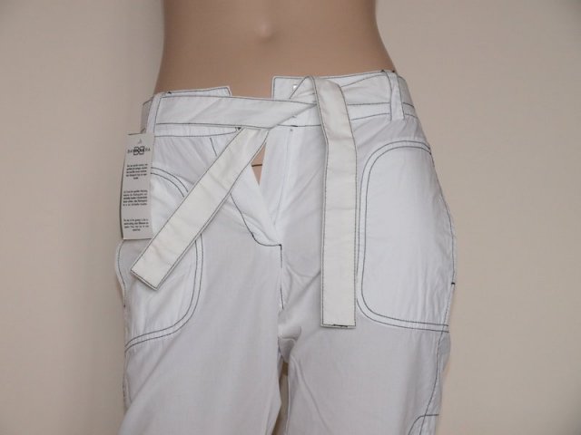 Letnie spodnie, holenderskiej marki Bandolera, w kolorze białym. Nowe z metką. Długość nogawki przy wzroście 160 nad kostkę. Obszycia czarną nitką, dodatkowo materiałowy pasek. Materiał 100% cienka sztywniejsza bawełna, Rozmiar z metki 36. Podaję wymiar mierzone na płasko: