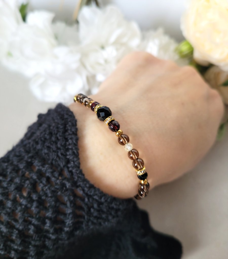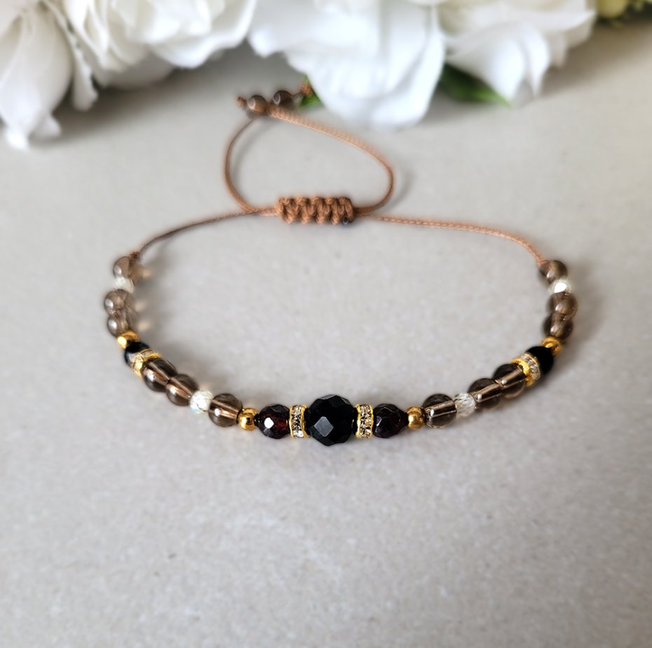 Damska bransoletka z kamieni naturalnych: Turmalinu, Granatu, Kwarcu dymnego oraz z Cyrkonii głównie przeznaczona dla zodiakalnego Barana.