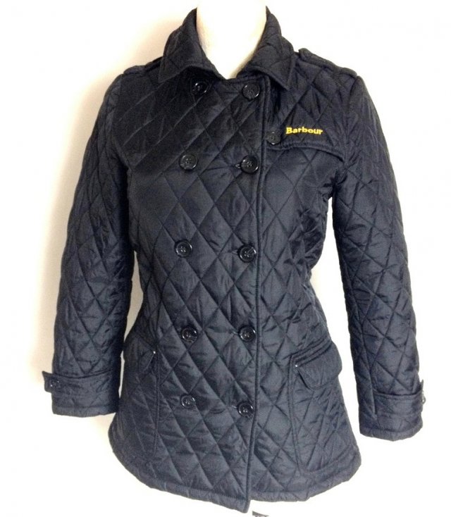 Świetna czarna pikowana kurtka renomowanej marki Barbour,ładnie skrojona- delikatnie poszerzana, po bokach kieszenie, z tyłu rozcięcie, zapinana na guziki.Na piersi logo charakterystyczne logo marki. Posiada podszewkę. Sezon- jesienno-zimowy.