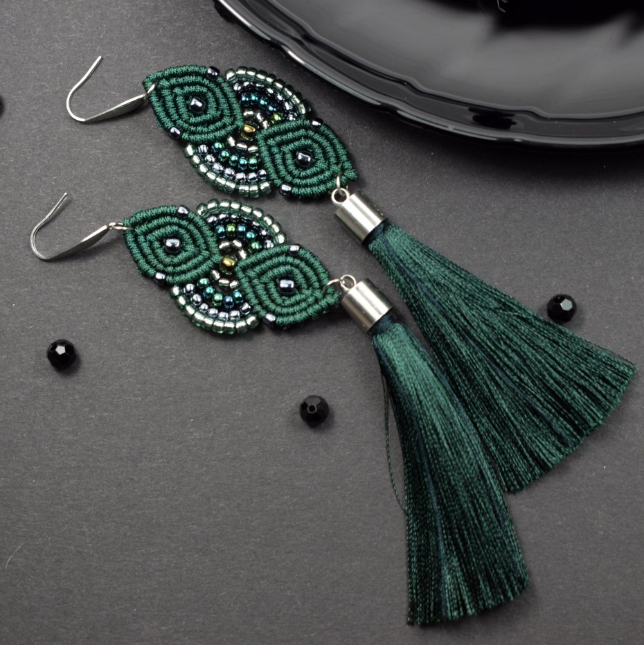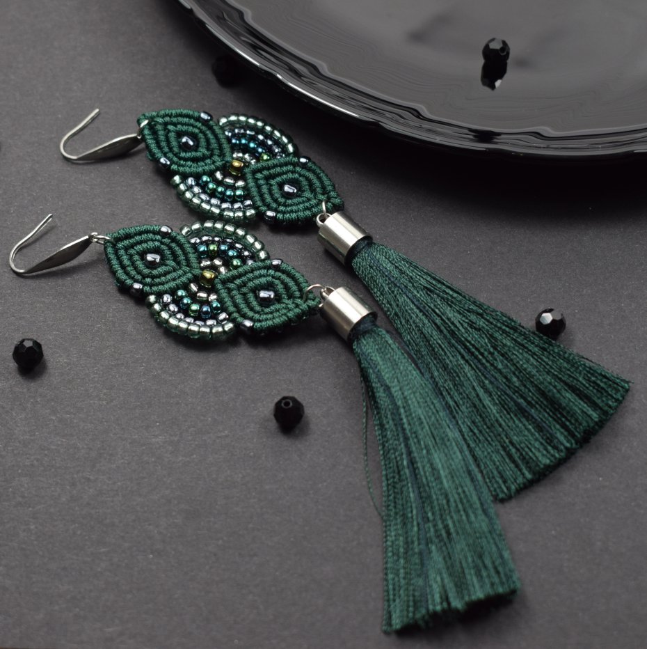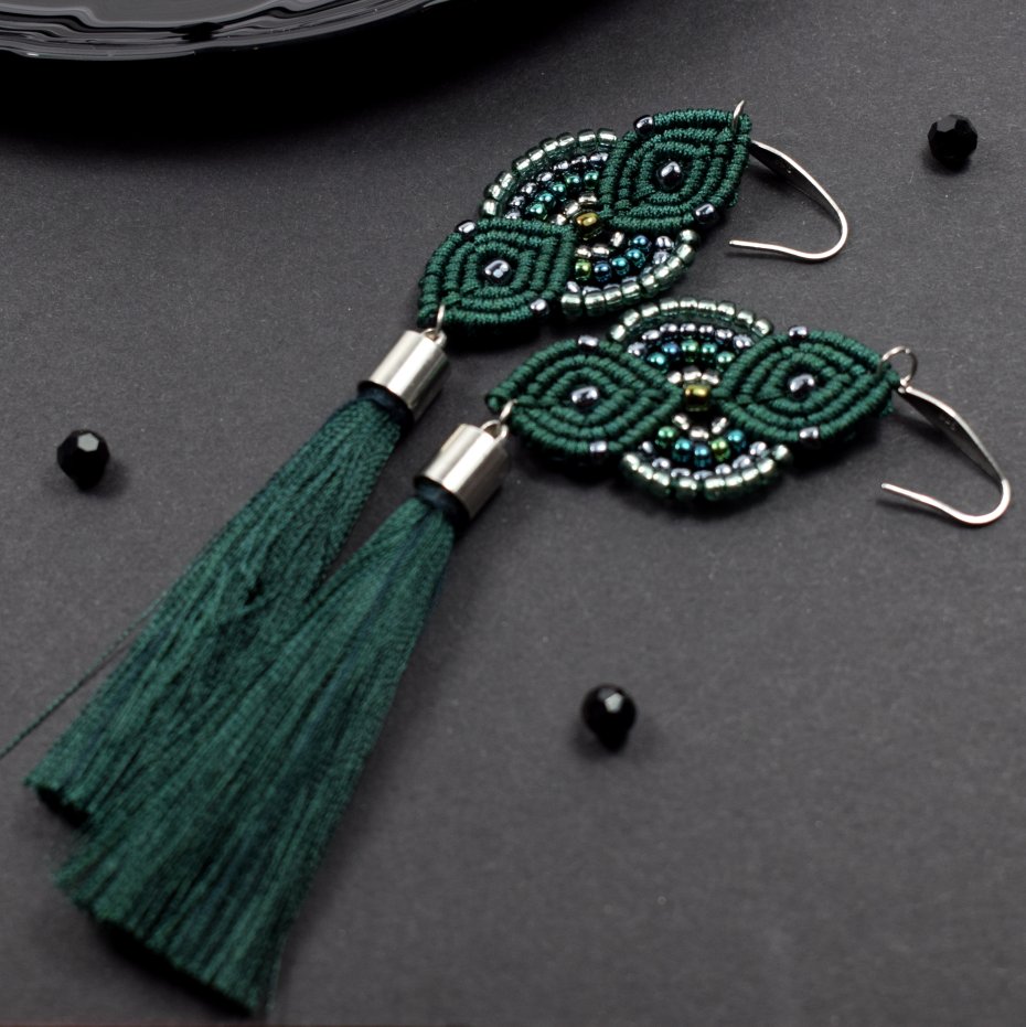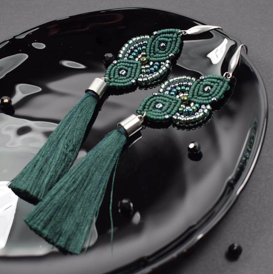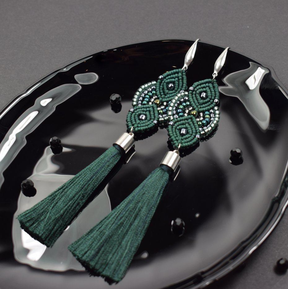 Ręcznie wykonane kolczyki stworzone techniką makramy z profesjonalnego sznurka w głębokim, butelkowym odcieniu zieleni. Ozdobione drobnymi koralikami w tonacjach srebra, szmaragdu i zieleni, które pięknie odbijają światło, nadając im subtelnego blasku i elegancji. Wykończone długimi chwostami z wiskozy.