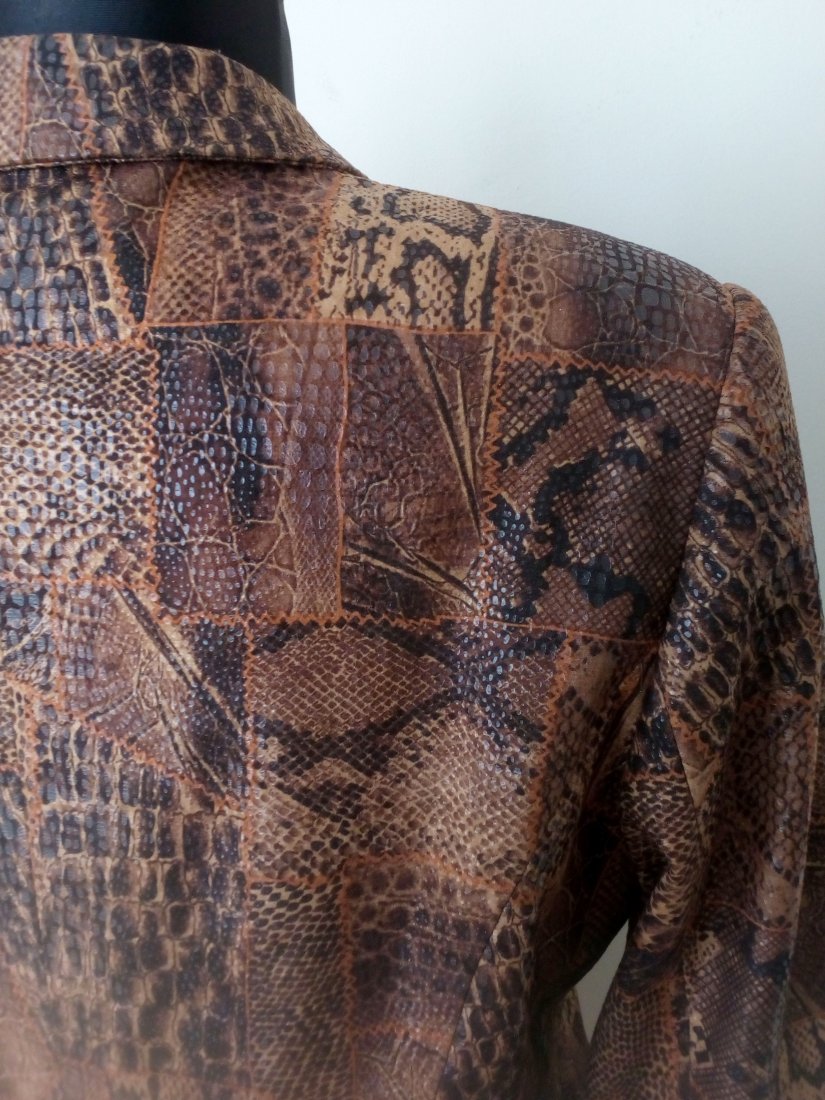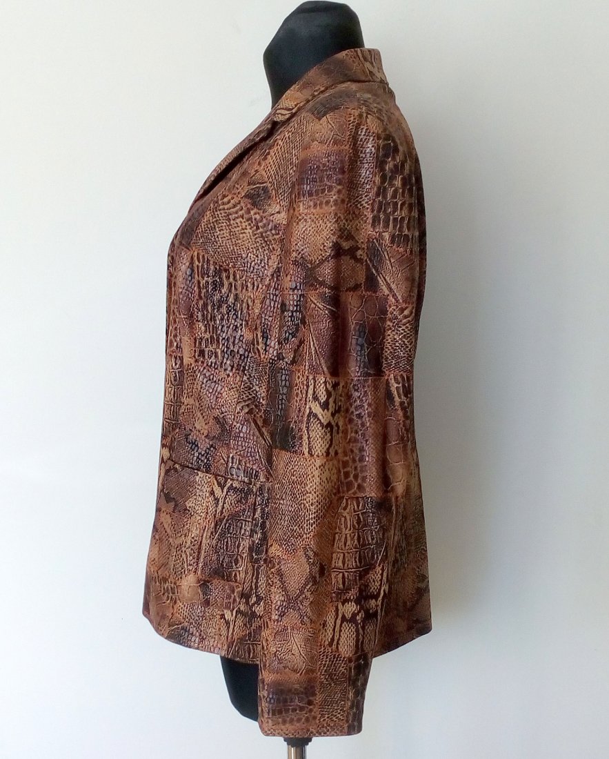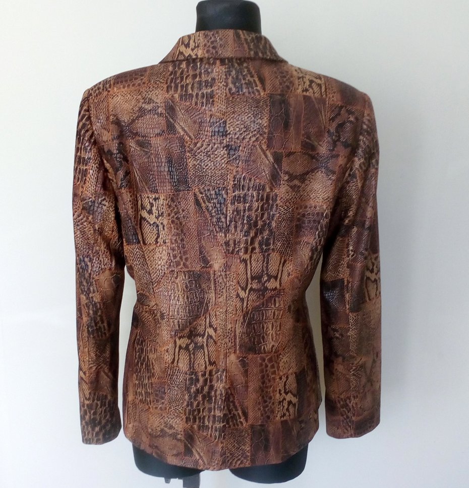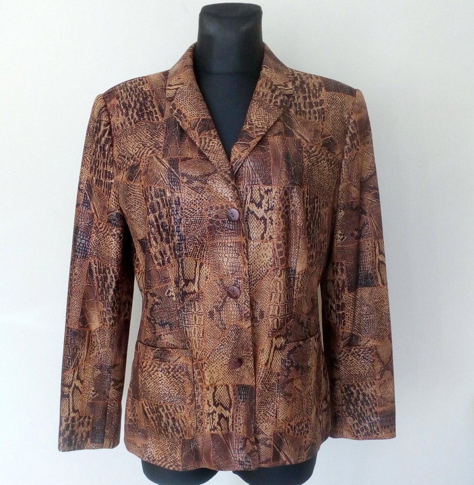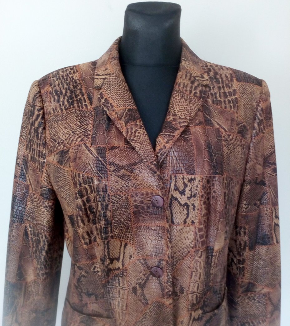 ładna marynarka z przyjemnego materiału, z przodu naszywane kieszenie, na ramionach poduszki, od środka podszewka w brązowym kolorze
