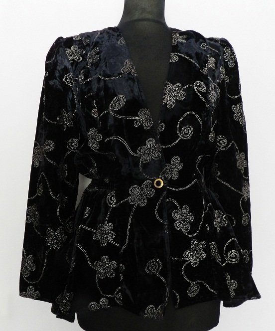 Aksmitna faktura materiału z wyszywanym biała nicia haftem, zapinanay na pojedynczy guzik, świetnie wykrojony tył 0 z marszczeniem, stan idealny,rozmiar 36/38