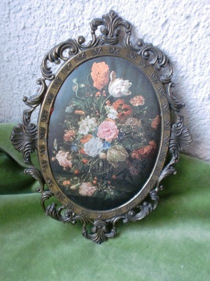 Piękny, nieduży obrazek w barokowym stylu. Ramka metalowa, bogato zdobiona, w kolorze starego złota, a w niej kwiaty na atłasie, pod spodem atłasu gąbka cieniutka, od spodu materiał biały w zielone ciapki podbity tekturką lub sklejką. Obrazek posiada małe metalowe kółeczko do zawieszenia. Niezwykle romantyczny i urokliwy. Made in Italy.