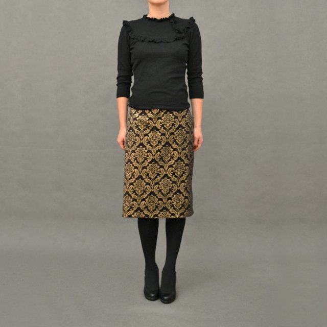 Piękna, prosta spódnica w złoty, barokowy wzór. Górna lamówka z eko skórki. Polecam bardzo.