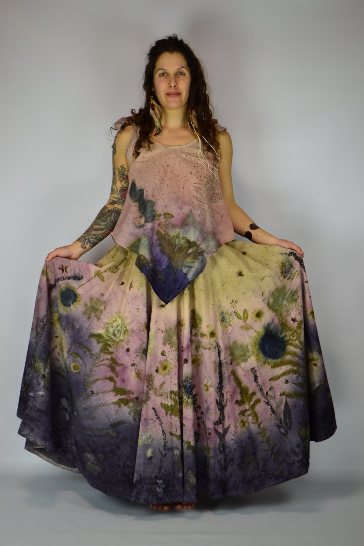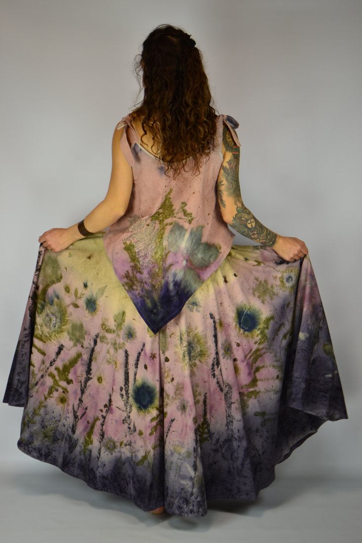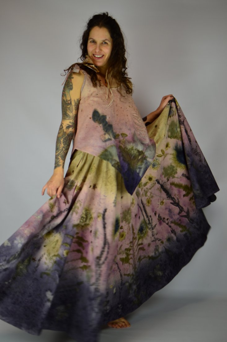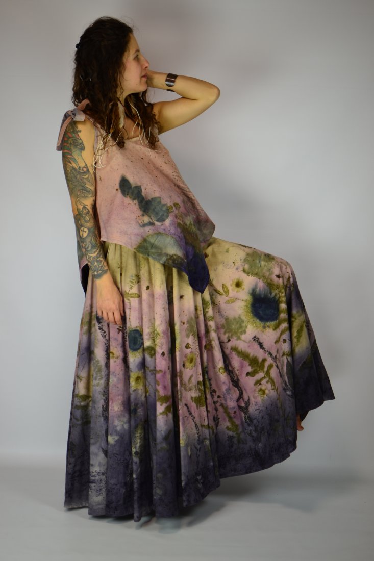 Spódnicę stworzyłam w procesie naturalnego barwienia roślinami techniką ecoprintu – druku kontaktowego. Do jej stworzenia użyłam ziela nawłoci, krwawnicy, dzikiej marchwi, kwiatów uczepu i słonecznika. Wyjątkowe łąkowe tło stworzone z wywarów z drewna modrzejca, brezylki i łupki cebuli.
