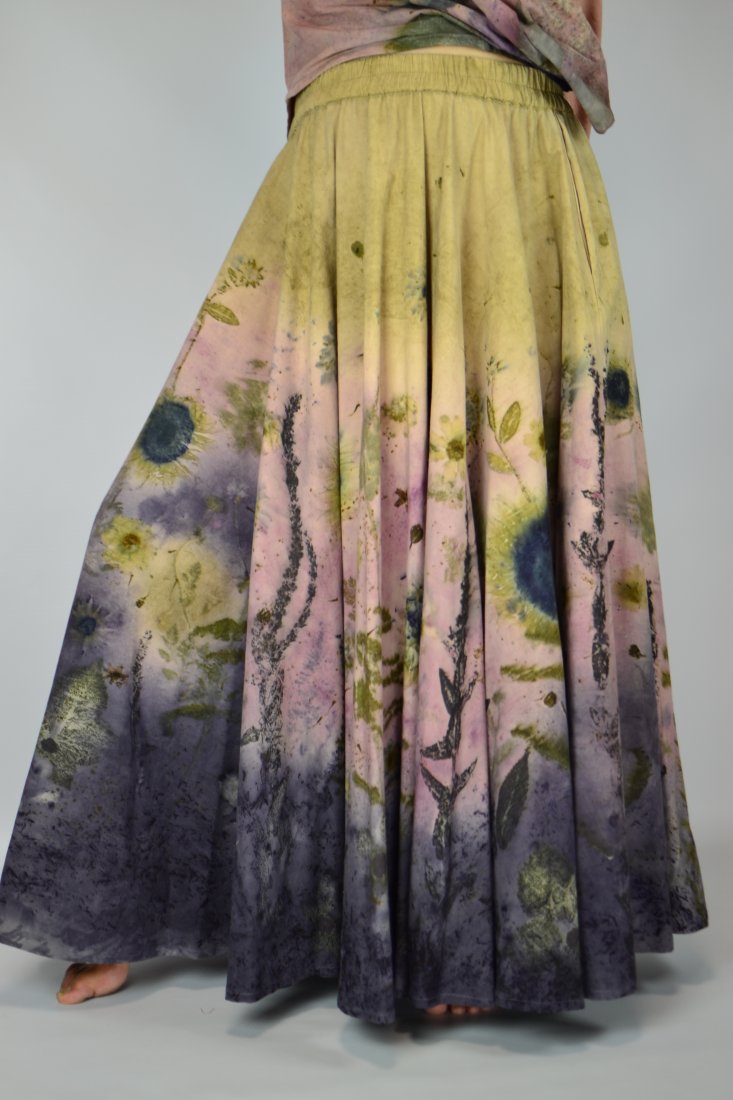Spódnica z koła "Łąka o Zachodzie", barwiona techniką ecoprint -każdy liść zostawił swój prawdziwy ślad.
