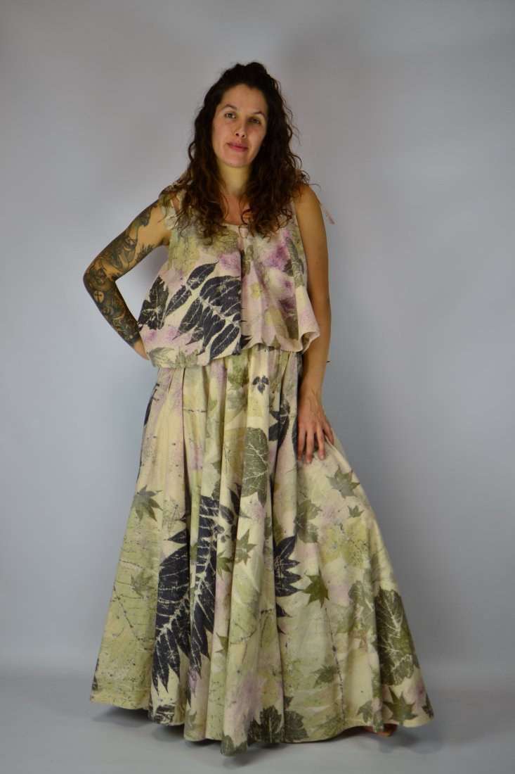 Spódnica powstała w procesie naturalnego barwienia roślinami techniką ecoprintu – druku kontaktowego. Do jej stworzenia użyłam liści sumaka, klonu, klonu palmowego i brezylki, które oddały swoje kształty i esencję tkaninie.