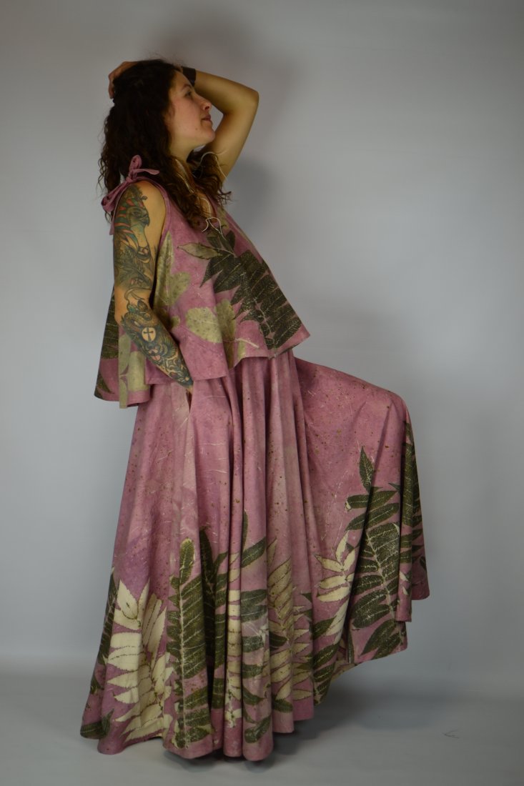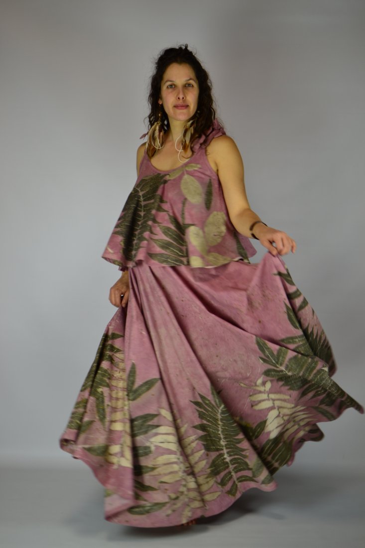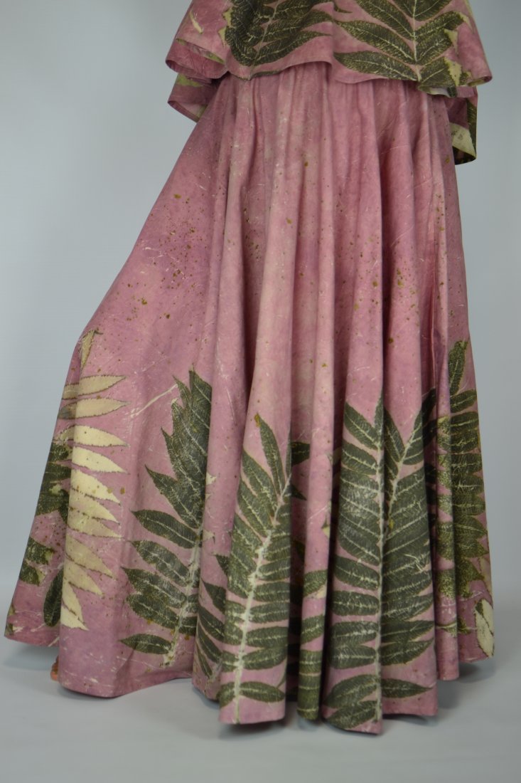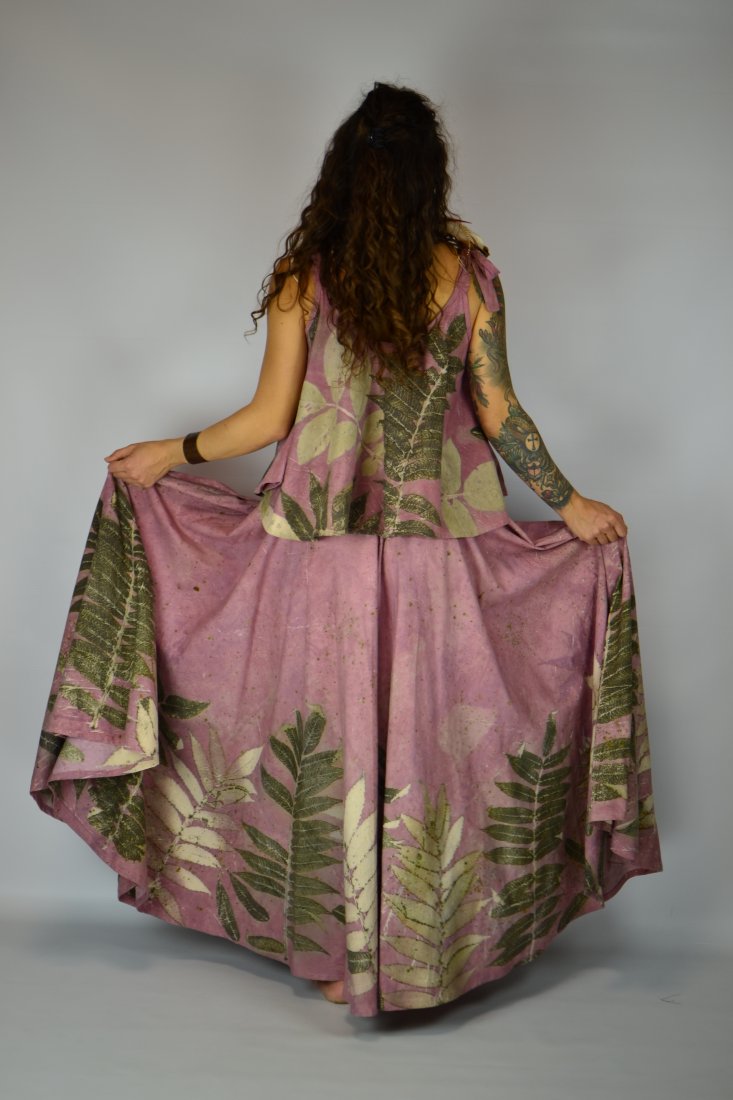 Spódnicę stworzyłam w procesie naturalnego barwienia roślinami techniką ecoprintu – druku kontaktowego. Do jej stworzenia użyłam liści sumaka, które oddały swoje kształty i esencję tkaninie. Rozkoszne różowe tło barwione wywarem z brezylki.