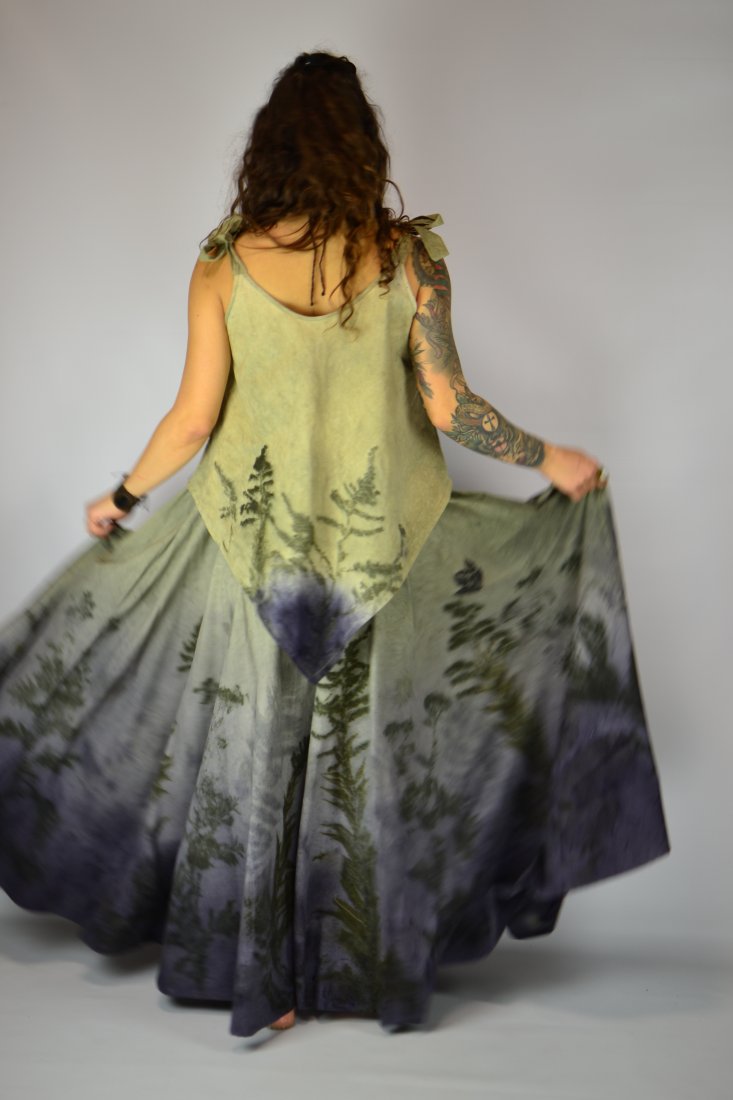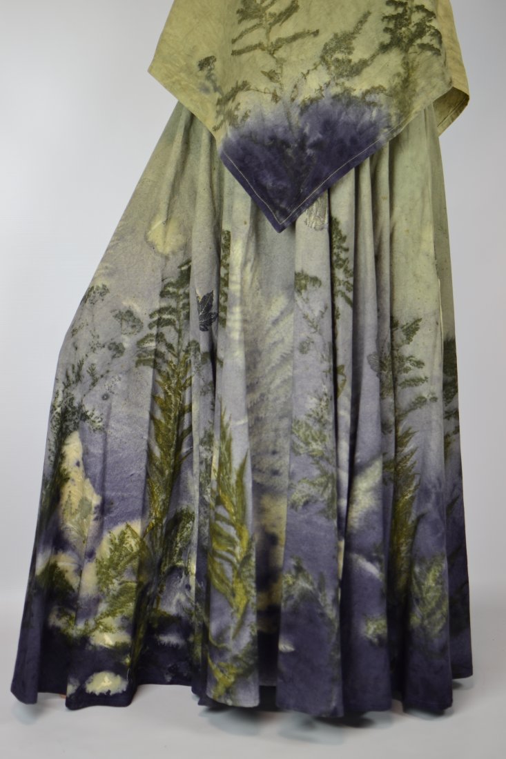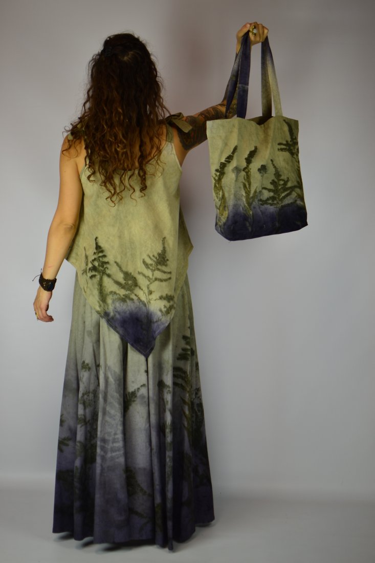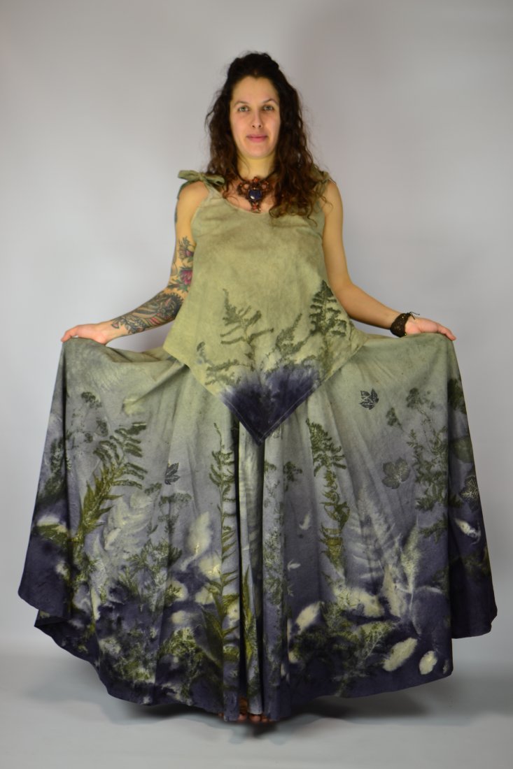 Spódnicę stworzyłam w procesie naturalnego barwienia roślinami techniką ecoprintu – druku kontaktowego. Do jej stworzenia użyłam ziela nawłoci, krwawnicy, paproci, liści sumaka i klonu. Wyjątkowe łąkowe tło stworzone z wywarów z drewna modrzejca i ziela wrotyczu.