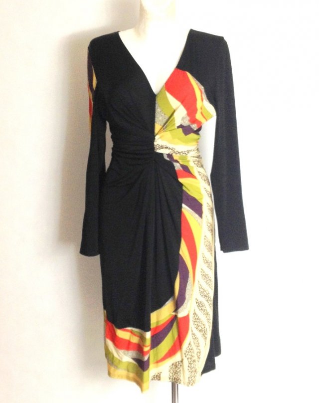 Śliczna czarna sukienka z kolorowymi wstawkami marki HEINE, wykonana z elastycznej , lejącej tkaniny, pod biustem drapowana - powinna ładnie tuszować ewentualne krągłości.