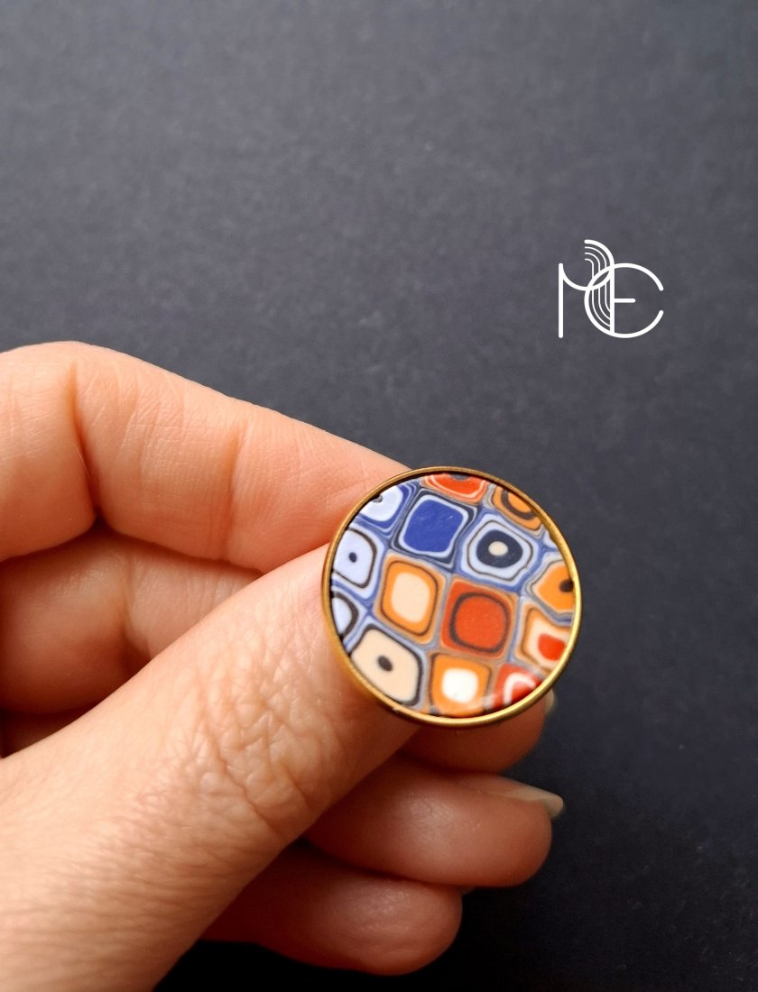 Pierścionek wykonany z wysokiej jakości glinki polimerowej, na bazie metalowej ze stali chirurgicznej w kolorze złota. Możliwość regulacji rozmiaru, nieuczulający metal. Pierścionek o unikatowym oczku i w jedynym egzemplarzu. Średnica oczka pierścionka - 2 cm.