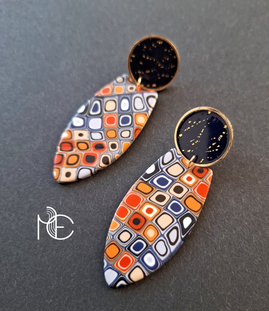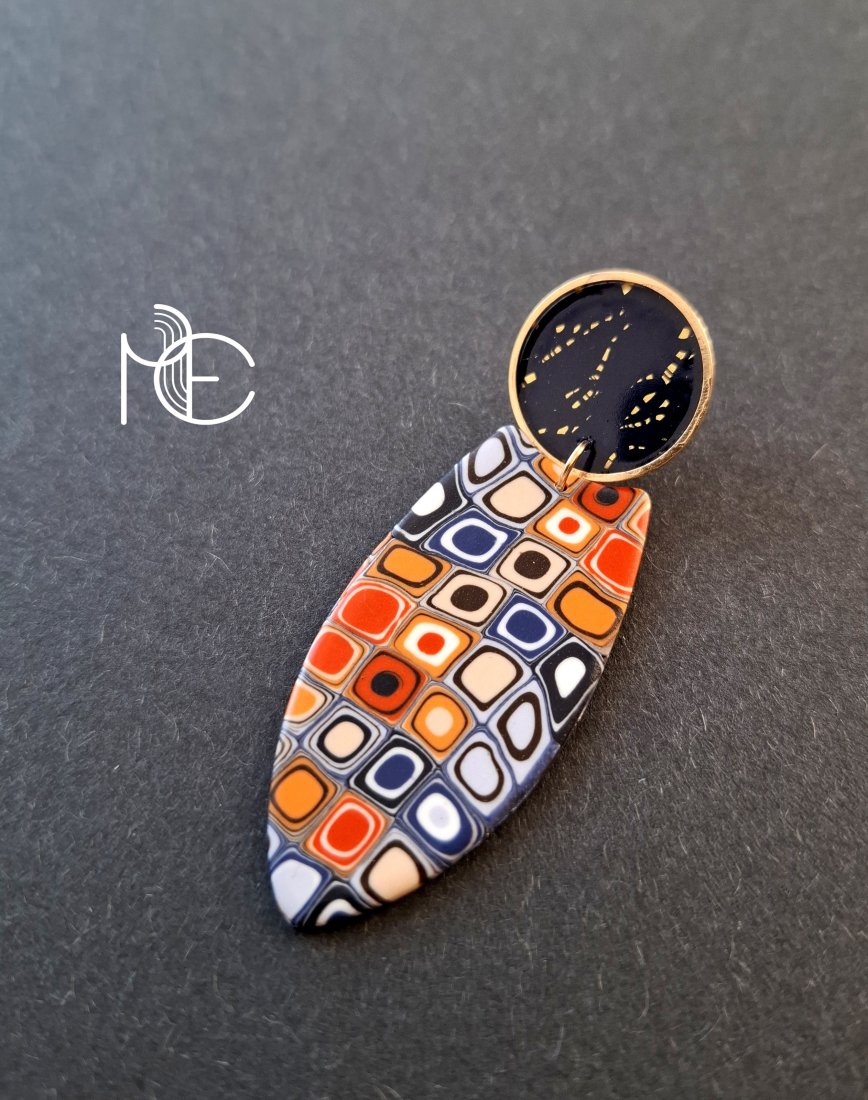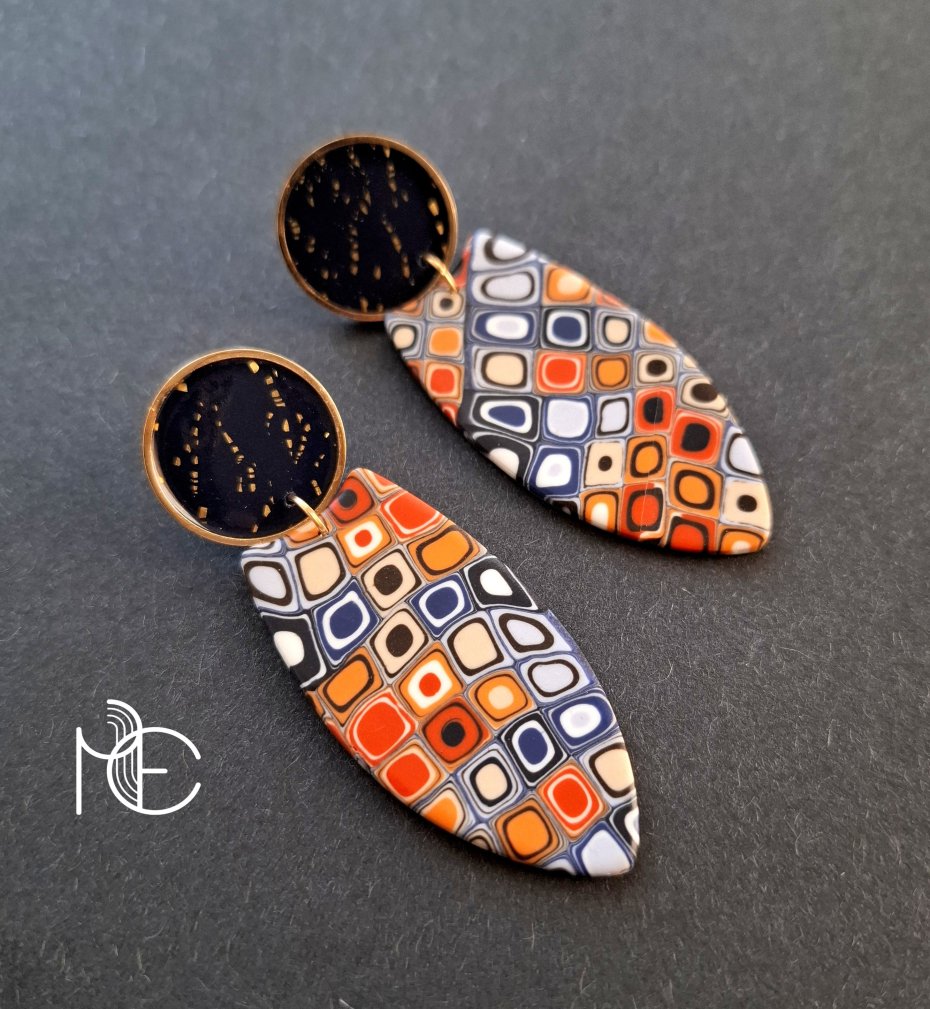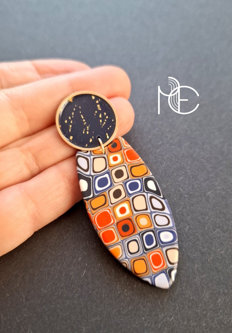 Kolczyki na sztyfty wykonane z wysokiej jakości glinki polimerowej z dodatkiem ozdobnych elementów metalowych. Jednostronne z pozłacanymi, nieuczulającymi sztyftami. Wymiary: długość wraz z zapięciem: 6,8 cm; szerokość max. 2,9 cm. Wykonane w jedynym egzemplarzu.