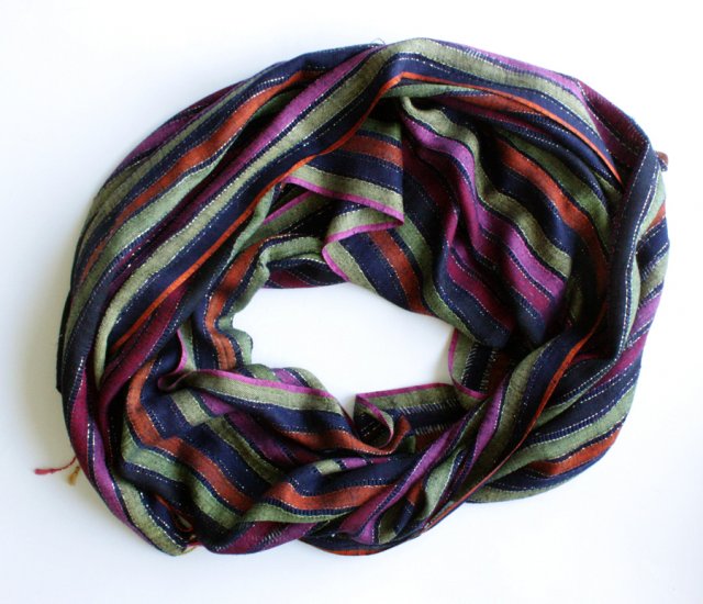 Duży szal w kolorowe pasy, przetykany gdzieniegdzie subtelną srebrną nitką. Kolory pasów: czerń (nie jest to granat jak na zdjęciu), zieleń, pomarańcz, czerwień, róż.