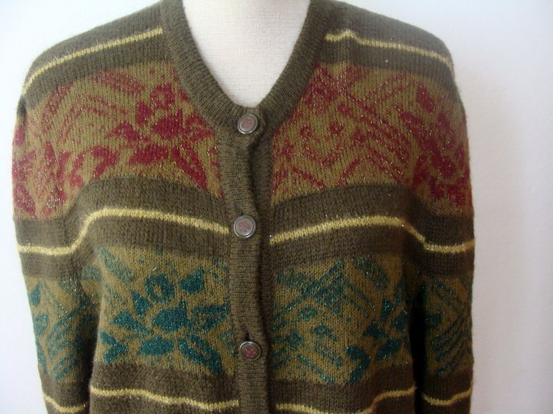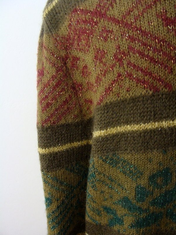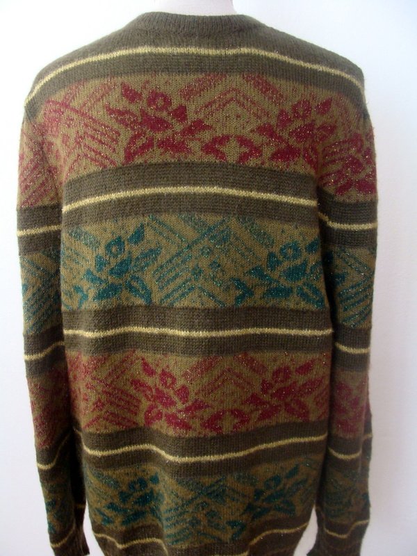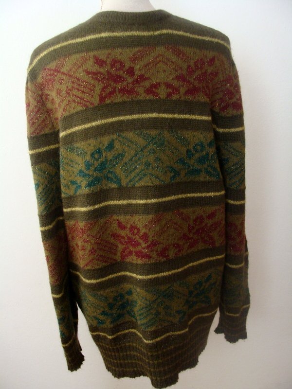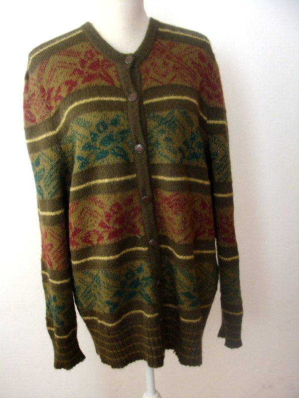 Miły wzorzysty sweter typu kardigan z dużym udziałem moheru, w pięknej zgaszonej kolorystyce kliku odcieni zieleni i borda , pasma z wzorami z wplecioną metaliczna nitką. Zapinany na oryginalne , ozdobne guziki. Wykończony ściągaczami. Miły, ciepły i lekki.