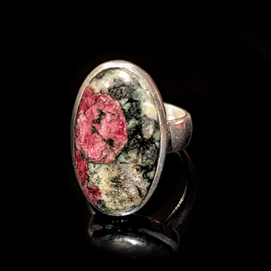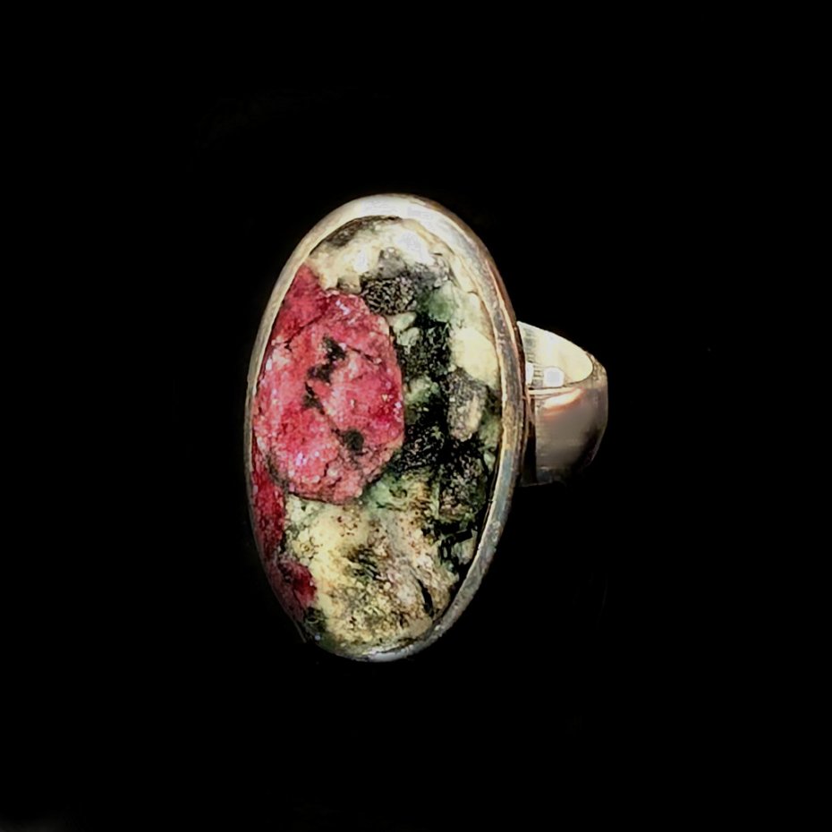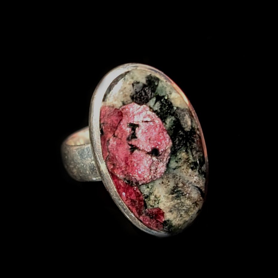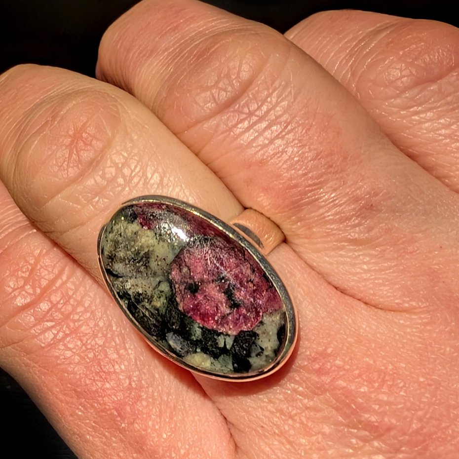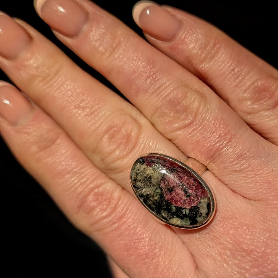 Rzadki i cenny minerał eudialit o pięknej strukturze skupień i inkluzji wewnątrz. Wspaniałe mineralne zjawisko,w którym przenikają odcienie głębokiego burgundu oraz szarości i srebra. Srebro pr. 925. Wymiary 25 x 15 mm. Waga 8,4 grama.. Rozmiar jubilerski regulowany w wąskim zakresie 15-19, proszę napisać na jaki dopasować, obrączka ma 5 mm szerokości. Pierścień zostanie wysłany w eleganckim pudełeczku. Wykonany przez dostawcę kamieni.