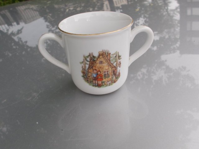 Dawnej Daty Porcelanowy Kubeczek dla dziecka. Nie plastikowy, nie chiński...Jakościowo, mocno porcelanowy. Pięknie baśniowo zdobiony. Jaś i Małgosia z obu stron kubka dziecko i rodzica cieszyć mogą. Wygodne dla nie wprawnych dziecięcych dłoni ucha dwa. Porcelana biała na błyszcząco szkliwiona, wzór w żywych, przyjemnych dla oka barwach. Delikatne złocenia. Sygnowany CZECHOSLOVAKIA .