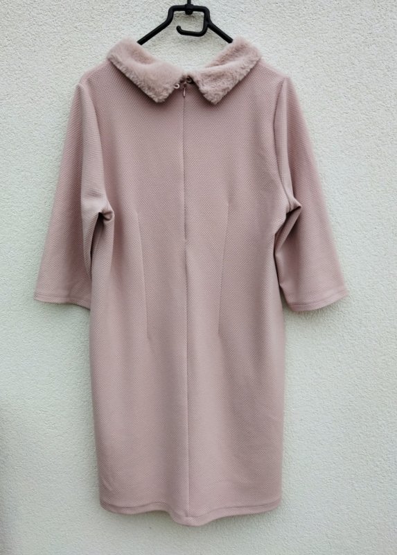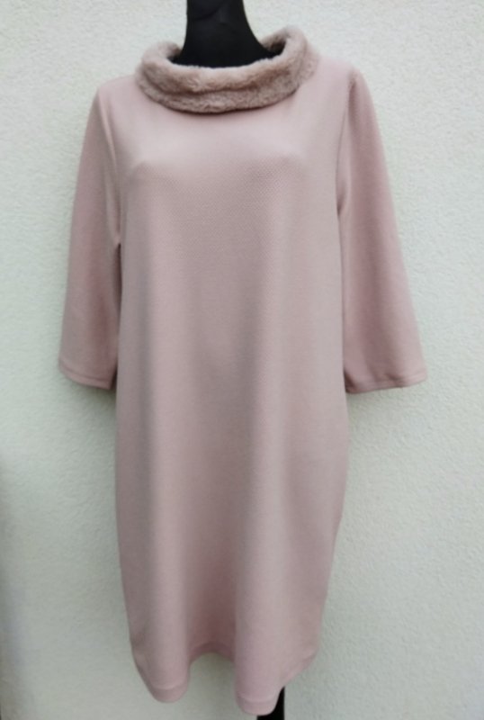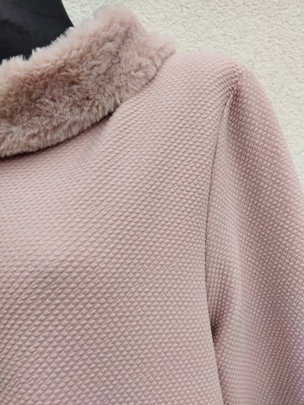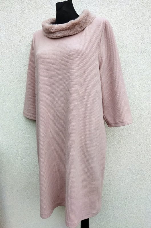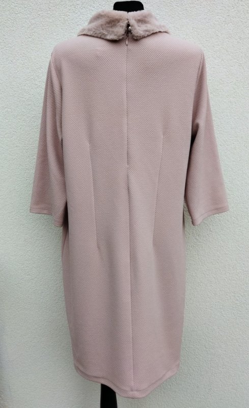 Sukienka z rozciągliwej najprawdopodobniej poliestrowej tkaniny z chropowata fakturą w kolorze dymnego różu. Z kołnierzem z miłego futerka w tym samym kolorze. minimalistyczny krój z zapięciem z tyłu na zamek. Na rozciągliwej podszewce.
