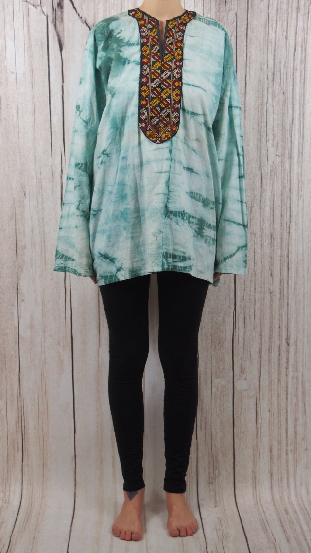 świetna afrykańska tunika batikowa z pięknie wyszywanym kołnierzem.