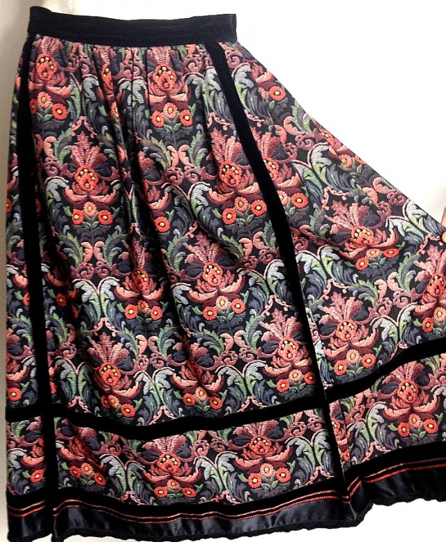 Oryginalna niemiecka bawarska maxi spódnica od Helene Strasser, spódnica rozkloszowana mocno rozłożysta, na podszewce, układa się w delikatne plisy, w pasie wykonana z aksamitu, czarne aksamitne wstawki idą pionowo w dół ,po bokach kieszenie boku, z tyłu zasuwana na suwak