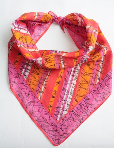 Miękka chusta w ciepłych odcieniach pomarańczu i różu. Materiał oceniam na bawełnę. Tkanina tkana luźnymi splotami.