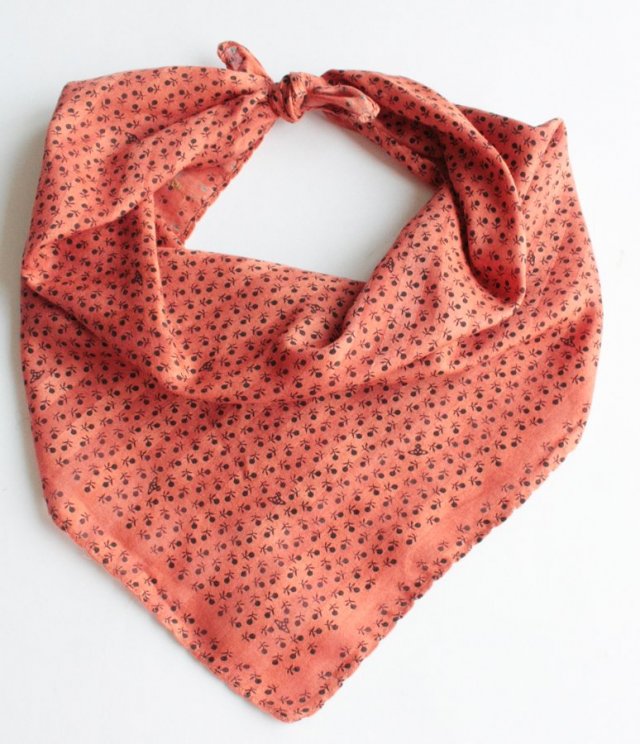 Niewielka chusta w ciepłym odcieniu pomarańczu w drobne wzorki. Materiał jest miękki, miły w dotyku. Jest to prawdopodobnie bawełna.