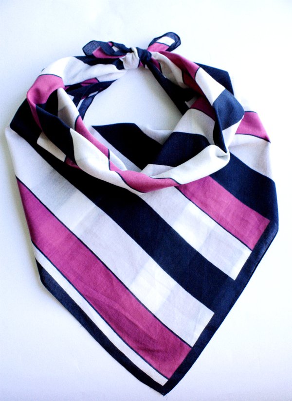 Oryginalna chusta w białe, czarne i fioletowo-buraczkowe pasy. Materiał to prawdopodobnie bawełna.