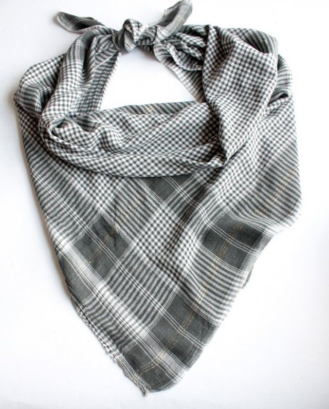 Miękka, duża chusta w kratę, przetykana miejscami bardzo subtelną, złotą nitką. Materiał oceniam na bawełnę.