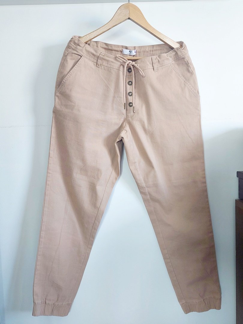 spodnie z marki AJC. materiał 97% bawełna, 3% elastan. nogawka zebrana na dole szeroką gumą, wysoki stan. zapięcie na logowane guziki. kolor beżowy. rozmiar z metki 42. stan prawdopodobnie nowe bez metki. proszę sprawdzić wymiary. Podaję wymiary mierzone na płasko: