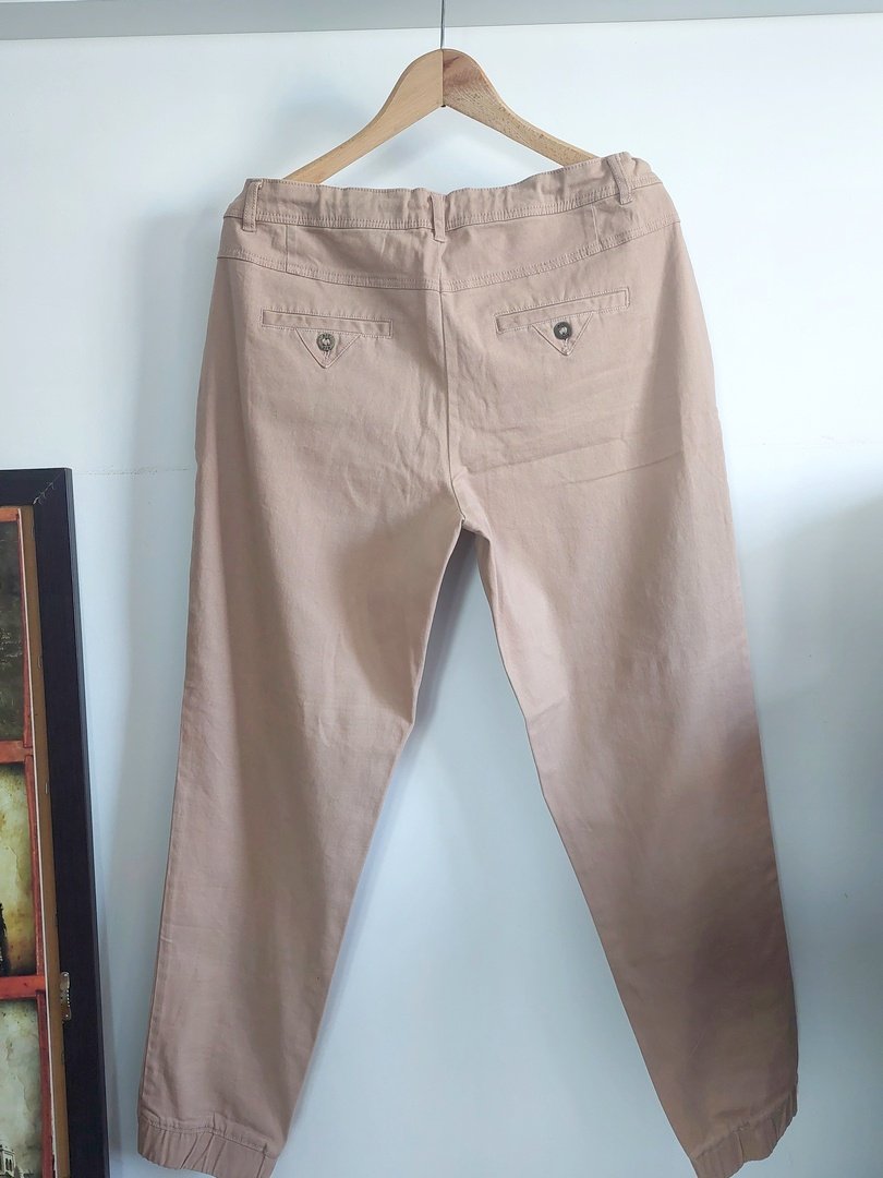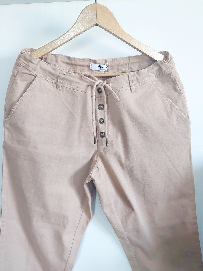 spodnie z marki AJC. materiał 97% bawełna, 3% elastan. nogawka zebrana na dole szeroką gumą, wysoki stan. zapięcie na logowane guziki. kolor beżowy. rozmiar z metki 42. stan prawdopodobnie nowe bez metki. proszę sprawdzić wymiary. Podaję wymiary mierzone na płasko: