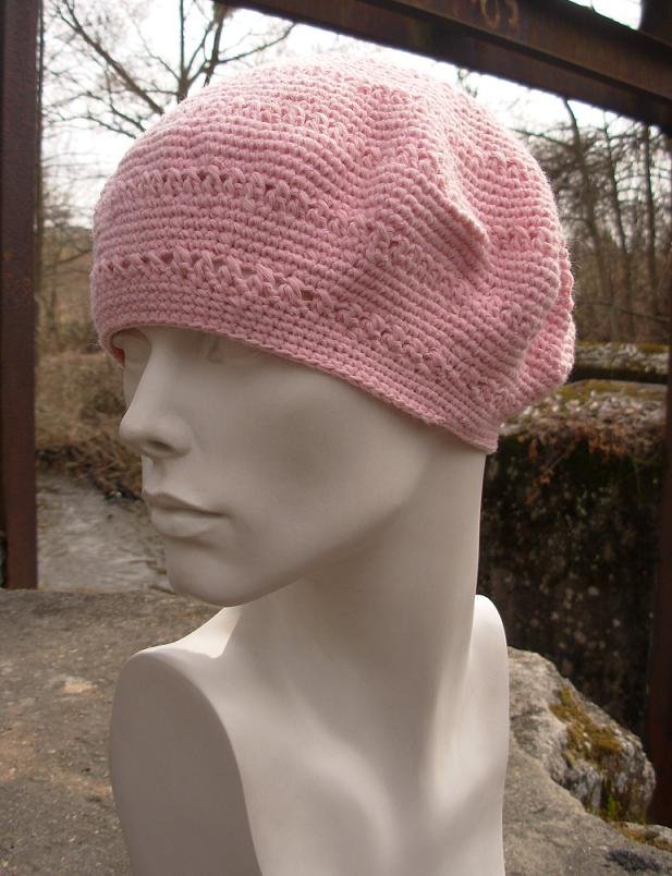 Beret ręcznie szydełkowany z włóczki bawełnianej (jasny pastelowy róż), grubszy, gęsto dziergany, dobrze się układa.