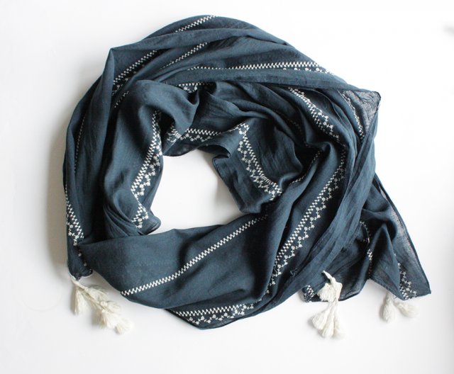 Ciekawie wykończony granatowy szal z miękkiej, delikatnej tkaniny, którą oceniam na bawełnę.