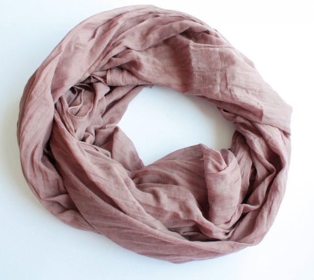Wielki, miękki szal w niebanalnym odcieniu brązu z kroplą wrzosowego fioletu. Materiał oceniam na bawełnę.