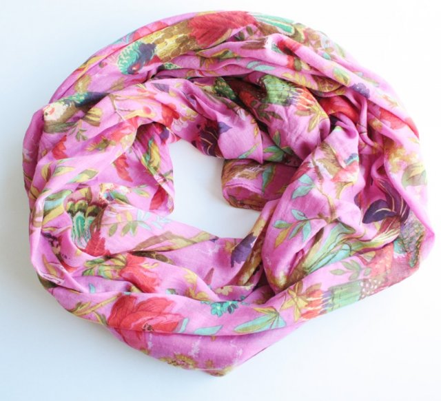 Bawełniany, miękki w dotyku, duży szal w roślinno-ptasie wzory. Będzie wspaniałym, bardzo kobiecym dodatkiem do wiosennych i letnich strojów.