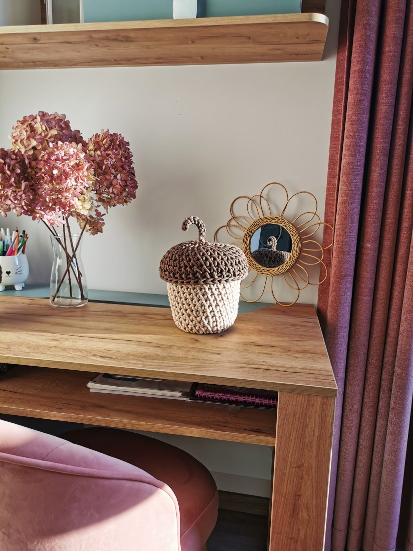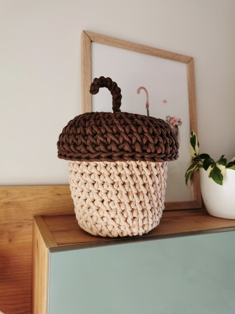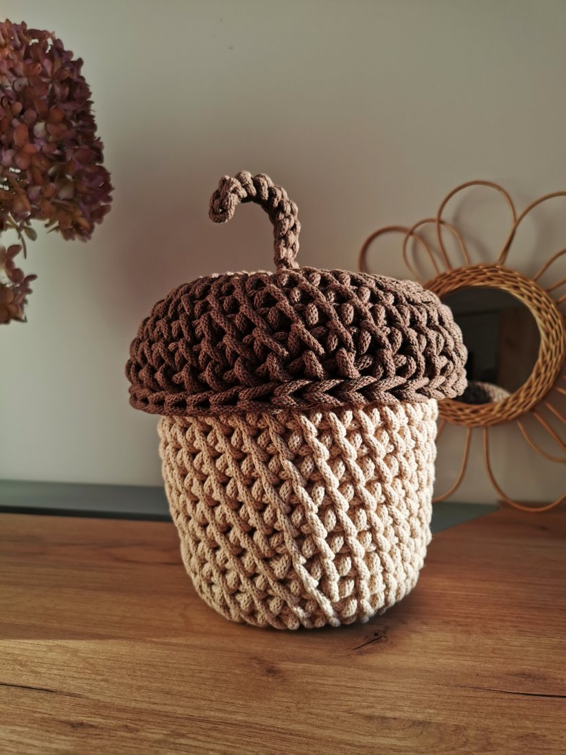 Dodaj odrobinę jesiennego uroku do swojego domu dzięki koszykowi żołędziowi wykonanemu ze sznurka bawełnianego. To nie tylko piękna jesienna dekoracja, ale również praktyczne miejsce do przechowywania drobiazgów, takich jak klucze, drobne zabawki czy kosmetyki.