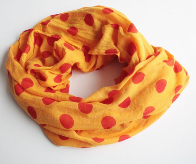 Miękki, bawełniany szal w grochy na tle ciepłego pomarańczu.