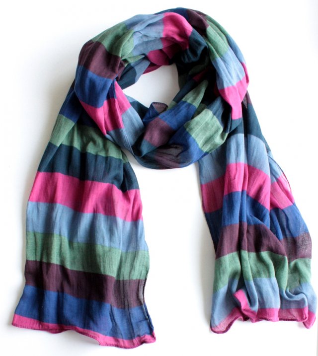 Miękki, bawełniany szal w pasy. Szal nie ma metki, jednak jest to delikatna bawełna.