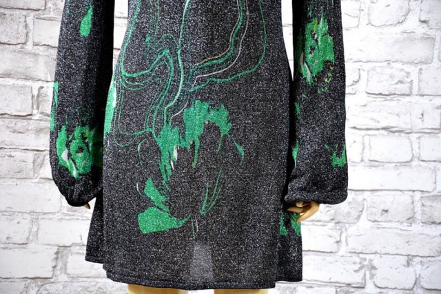 Świetna posrebrzana sukienka marki Bebe w zielone kwiatuszki, fason delikatnie poszerzany, wykonana z lejącej tkaniny.