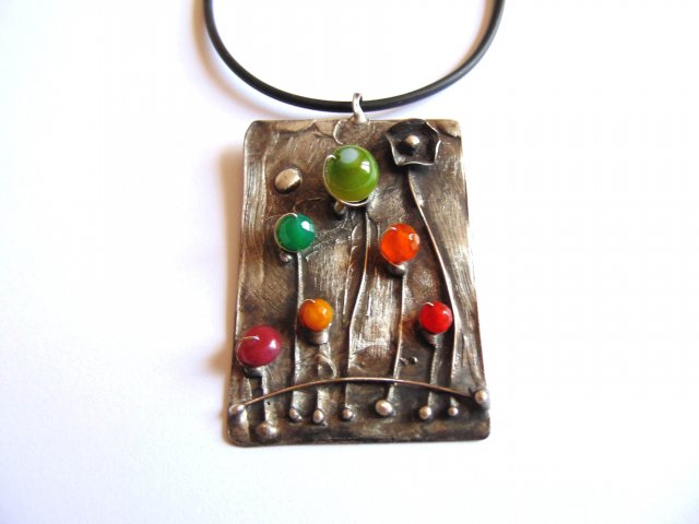 Wisiorek wykonany z miedzi, cyny, agatów i jadeitów. Zawieszony na czarnej lince kauczukowej o długości ok. 45 cm. Wymiary ok. 7 na 5 cm.